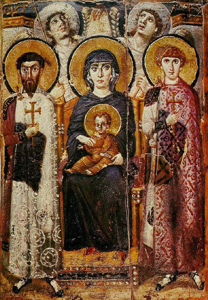 Marie Mère de Dieu (Theotokos) trônant entre saint Théodore et saint Georges. Icône du monastère Sainte -Catherine, Sinaï, VIès.