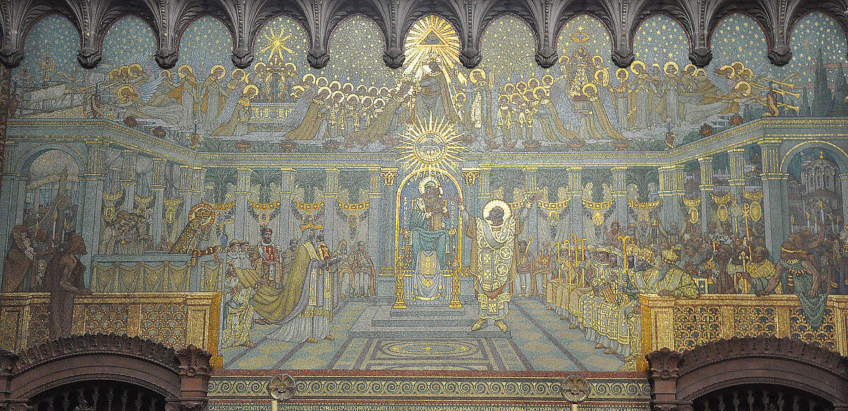 Le concile d’Éphèse (431).Mosaïque de Notre-Dame de Fourvières, Lyon. Au centre Saint Cyrille montre l'enfant et Marie, proclamant la maternité divine de la Vierge. Philippe Alès, CC BY-SA 3.0 <https://creativecommons.org/licenses/by-sa/3.0>, via Wikimedia Commons.