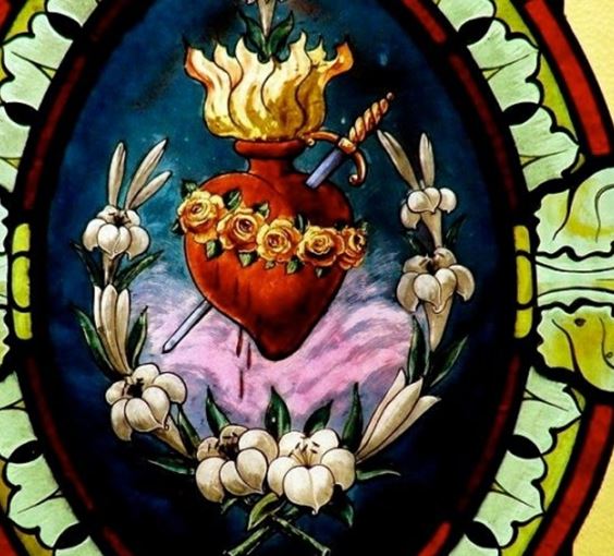 Le Cœur Immaculé de Marie : détail du vitrail réalisé par Oskar Berbig (1884–1930), pour l’église d’Andiast (Suisse), dédiée aux saints Cyricus et Julitta, martyrs du IVès.